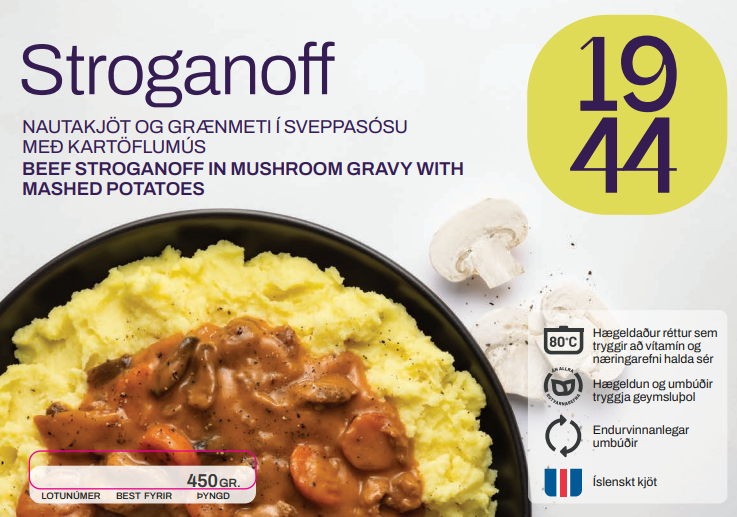 "description": "Sveppasósa (36%): Soð, mjólk, tómatar, rjómi, tómatþykkni, bindiefni (1422), tómatsósa (tómatar, kornsýróp, edik, salt, laukduft, hvítlauksduft, bragðefni), sinnep, grænmetiskraftur (sellerí), salt, sykur, nautakraftur, hvítlaukur, krydd, litarefni(E150c). Íslenskt nautgripakjöt(20%), repjuolía, grænmeti(13%): Sveppir, gulrætur, blaðlaukur, laukur, paprika. Kartöflumús(31%): Vatn, kartöflur, nýmjólkurduft, mjólkurprótín, bragðefni, mjólk, sykur, smjör, salt. / MJÓLK, SINNEP, SELLERÍ.",