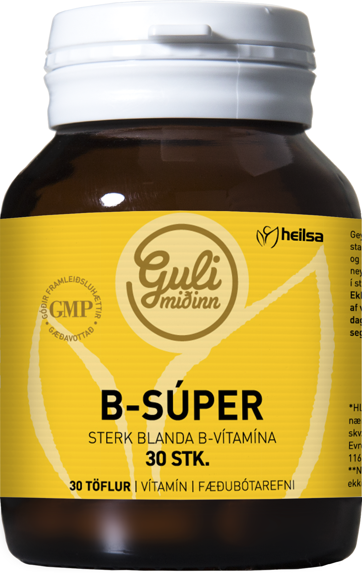 "description": "Hver tafla inniheldur: B1 (thiamine mononitrate) 30mg, B2 (riboflavin) 30mg, B3 (niacinamide) 100mg, B6 (pyridoxine HCl) 25mg, fólínsýra 400mcg, B12 (cyanocobalamin) 100mcg, bíotín 300mcg, B5 (d-calcium pantothenate) 50mg, kólín 50mg, inositol 50mg, PABA 30mg. Virk efni (níasínamíð, kalsíum-D-pantótenat,\nkólín bítartrat, inósítól, þíamínmónónítrat, ríbóflavín, PABA, pýridoxínhýdróklóríð,\nteróýlmónóglútamínsýra, D-bíótín, sýanókóbalamín). Bindiefni (díkalsíumdífosfat,\nörkristallaður sellulósi, kroskarmellósanatríum, hydroxýpropyl sellulósi, karboxýmethyl\nsellulósa natríum, hypromellósi, maltódextrín, CompactCel, hert jurtafita, gúargúmmí), kekkjavarnarefni (sterínsýra, magnesíumsterat, kalsíumsterat, talkúm, kísildíoxíð, póvídón, tríasetín), karóbduft, húðunarefni (polyethylene glycol, carnauba vax), sterkja (korn), hrísgrjónaklíð.",