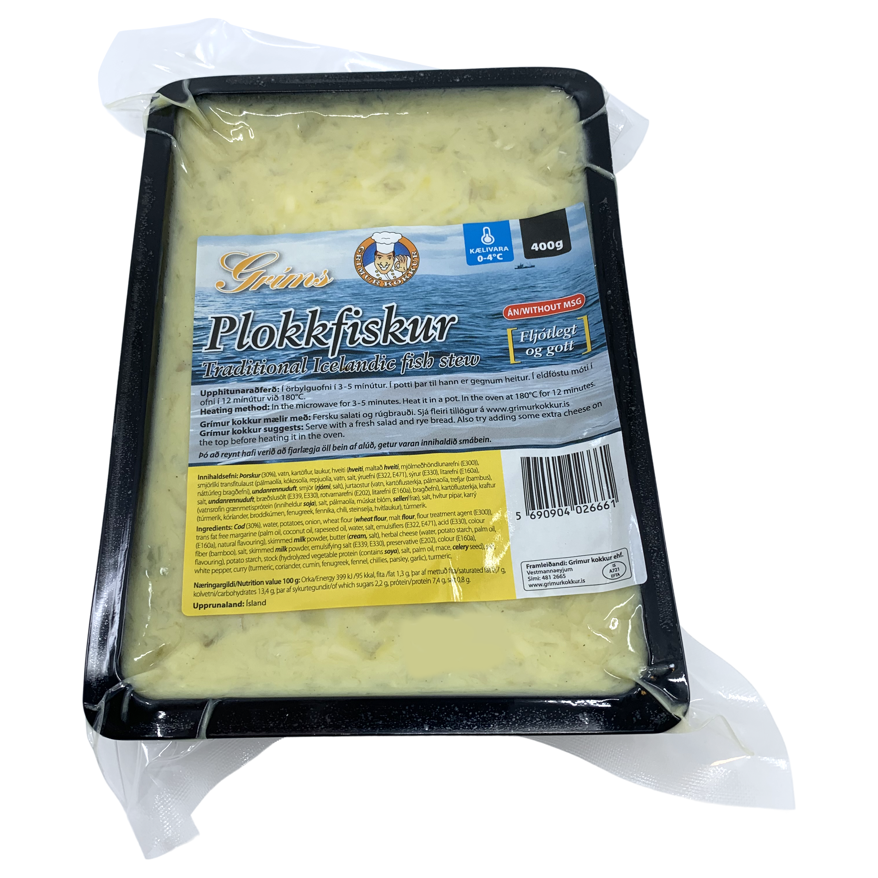 "description": "Þorskur (30%), vatn, laukur, kartöflur, hveiti (hveiti, maltað hveiti, mjölmeðhöndlunarefni (E300)), smjörlíki transfitulaust (pálmaolía, kókosolía, repjuolía, vatn, salt, ýruefni (E322, E471), sýrur (E330), litarefni (E160a), náttúrleg bragðefni), undanrennuduft, smjör (rjómi, salt), jurtaostur (vatn, kartöflusterkja, pálmaolía, trefjar (bambus), salt, undanrennuduft, bræðslusölt (E339, E330), rotvarnarefni (E202), litarefni (E160a), bragðefni), salt, kartöflusterkja, kraftur (vatnsrofin grænmetisprótein (inniheldur soja), pálmaolía, múskat blóm, sellerí fræ), hvítur pipar, karrý (túrmerik, kóríander, broddkúmen, fenugreek, fennika, chili, steinselja, hvítlaukur), túrmerik. ",