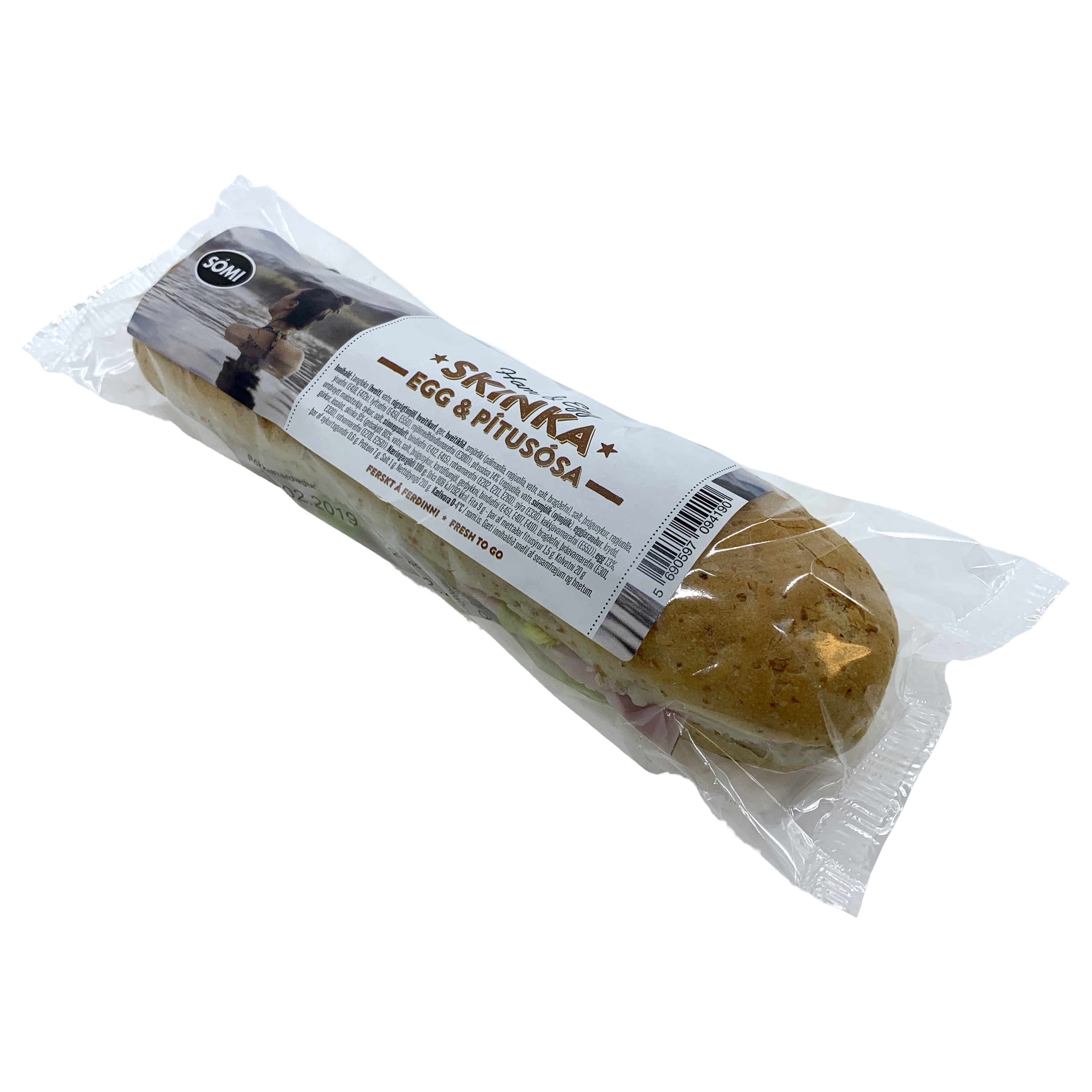 "description": "Langloka (hveiti, vatn, rúgsigtimjöl, hveitikurl, ger, hveitiklíð, smjörlíki (pálmaolía, repjuolía, vatn, salt, bragðefni), salt, þrúgusykur, repjuolía, ýruefni (E418, E472e), lyftiefni (E450, E550), mjölmeðhöndlunarefni (E300)), pítusósa 14% (repjuolía, vatn, súrmjólk (nýmjólk), eggjarauður, krydd, umbreytt maíssterkja, sykur, salt, sinnepsduft, bindiefni (E412, E415), rotvarnarefni (E202, E211, E260), sýra (E330), kekkjavarnarefni (E551)), egg 13%, gúrkur, íssalat, skinka 9% (grísakjöt 80%, vatn, salt, þrúgusykur, kartöflumjöl, gerþykkni, bindiefni (E451, E407, E410), bragðefni, þráavarnarefni (E301, E330), rotvarnarefni (E270, E250)). ",