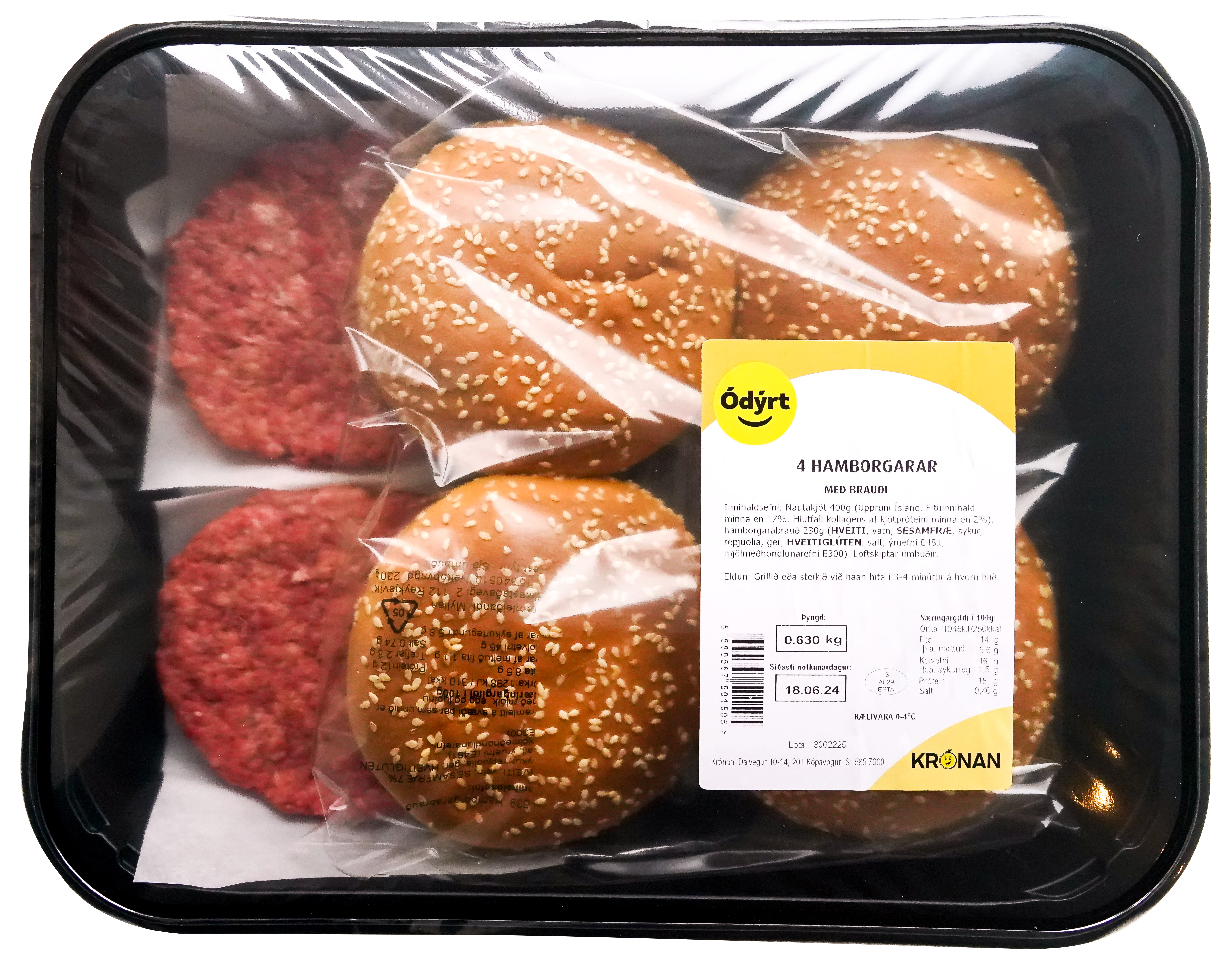 "description": "Nautakjöt 400g Uppruni Ísland. (Fituinnihald minna en 17%. Hlutfall kollagens af kjötpróteini minna en 2%), hamborgarabrauð 200g (HVEITI, vatn, SESAMFRÆ, sykur, repjuolía, ger, HVEITIGLÚTEN, salt, ýruefni E481, mjölmeðhöndlunarefni\nE300). Loftskiptar umbúðir.\n\nEldun: Grillið eða steikið við háan hita í 3-4 mínútur á hvorri hlið.\"\n",
