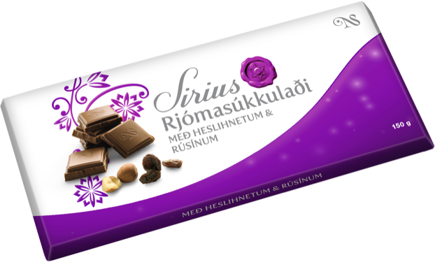 "description": "Rjómasúkkulaði (sykur, kakósmjör, NÝMJÓLKURDUFT, UNDANRENNUDUFT, kakómassi, ýruefni (SOJALESITÍN), bourbon vanilla. Kakóþurrefni 33% að lágmarki), HESLIHETUR og rúsínur (að lágmarki 10%), sólblómaolía. FRAMLEITT Í VERKSMIÐJU ÞAR SEM UNNIÐ ER MEÐ MJÓLK, SOJA, TRJÁHNETUR OG HVEITI.",