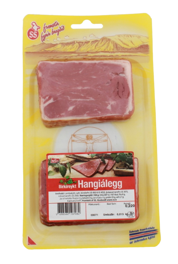 "description": "Í 100g af hangiáleggi eru notuð 107g af lambakjöti. Lambakjöt, salt, bindiefni (E450 til E452), rotvarnarefni (E250), þráavarnarefni (E301). Upprunaland kjöts: Ísland",