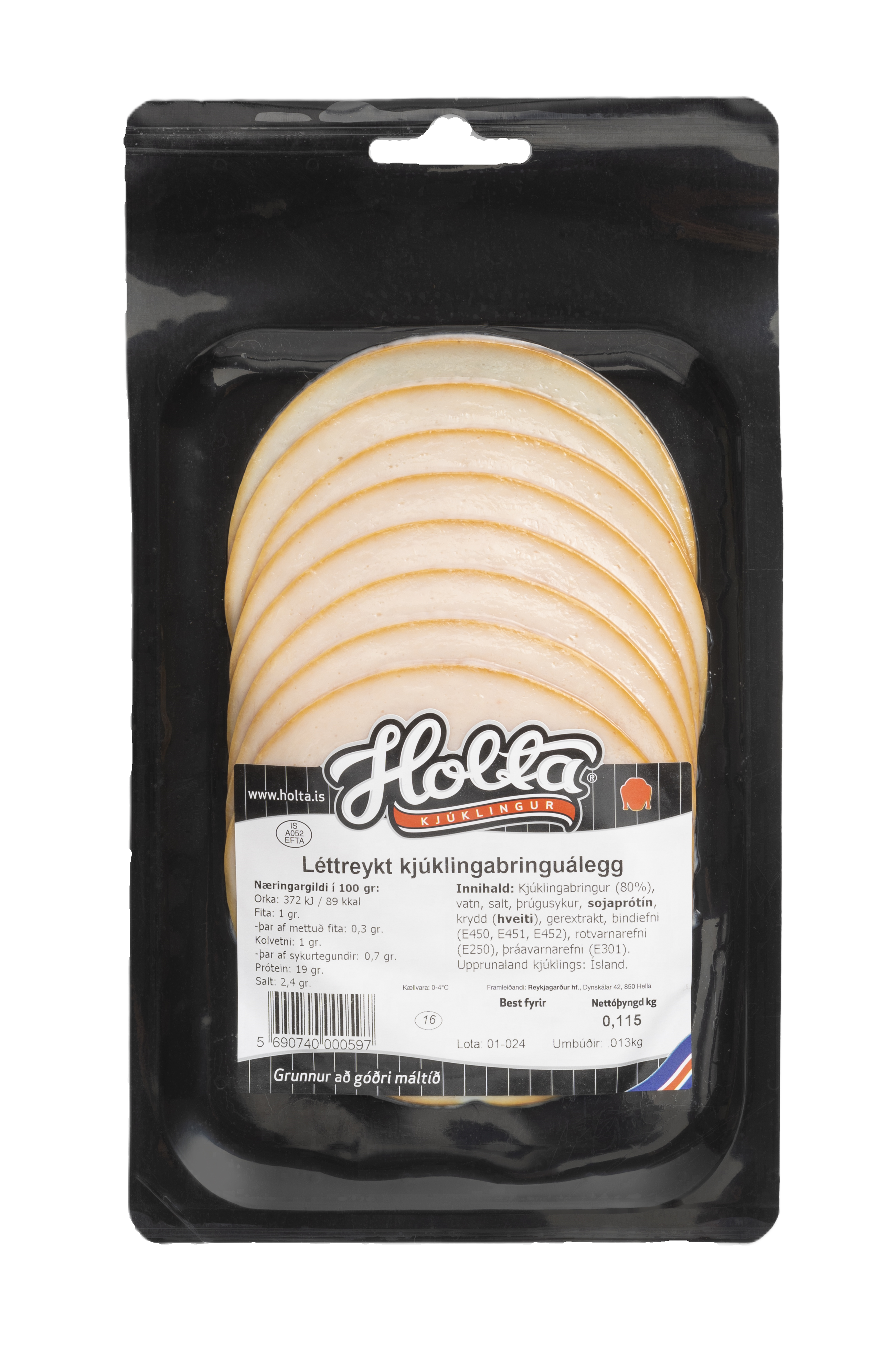 "description": "Kjúklingabringur (80%), vatn, salt, þrúgusykur, sojaprótín, krydd (hveiti), gerextrakt,bindiefni (E450, E451, E452), rotvarnarefni (E250), þráavarnarefni (E301),Upprunaland kjúklings: Ísland",