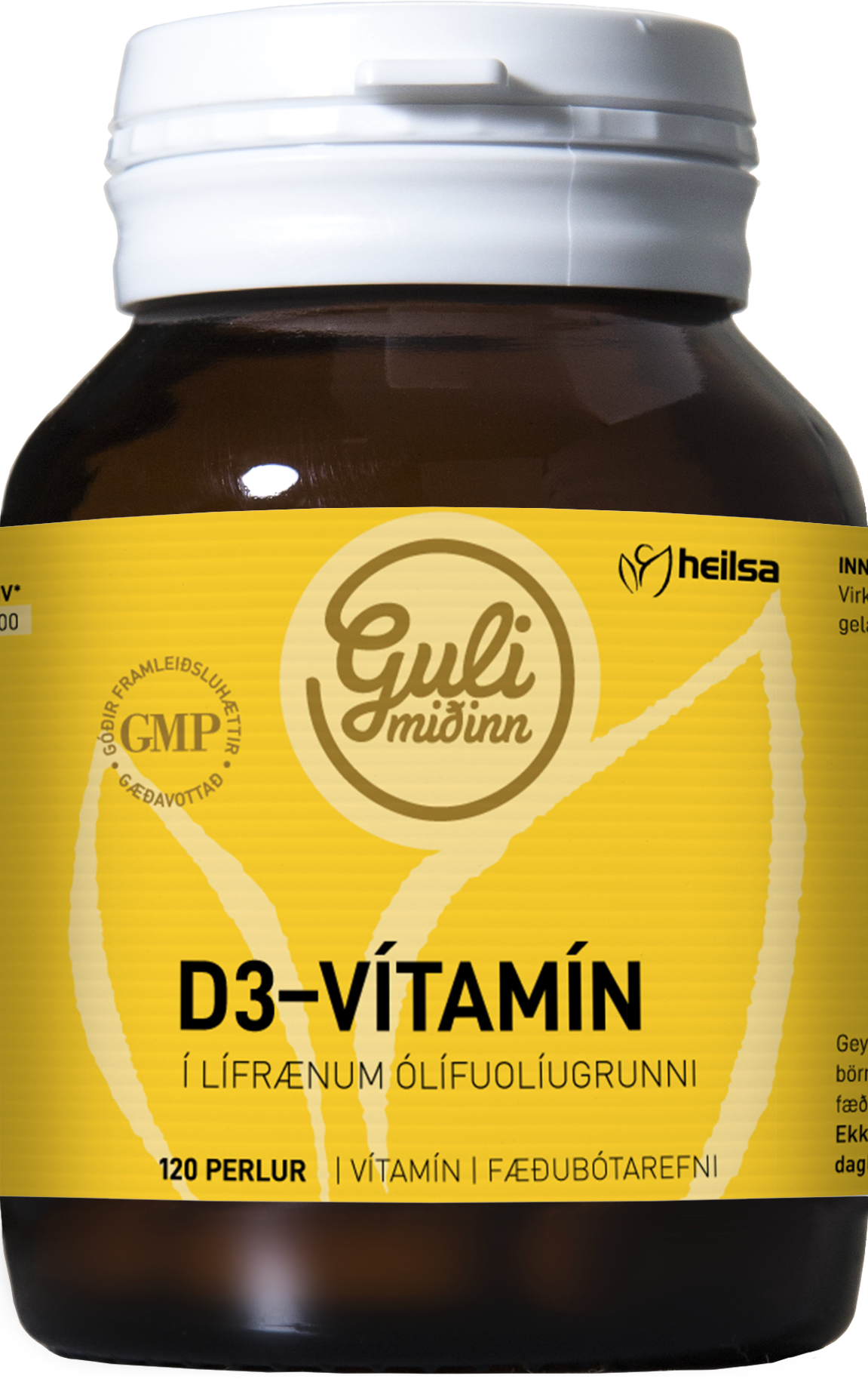"descriptionDetail": "Rannsóknir hafa sýnt fram á að fólk á norðlægum slóðum þarfnast aukins D-vítamíns á veturna vegna þess hve stuttrar dagsbirtu nýtur þá við, og þessi litla birta nægir ekki til að byggja upp forða D3-vítamíns í líkamanum. Því er inntaka D vítamíns nauðsynleg öllum sem búa á Íslandi. D3-Vítamínið í Gula miðanum er 2000 ae eða 50 uq, en það er það sem margir telja að sé nauðsynlegur skammtur fyrir fullorðinn einstakling hér á norðurslóðum.",