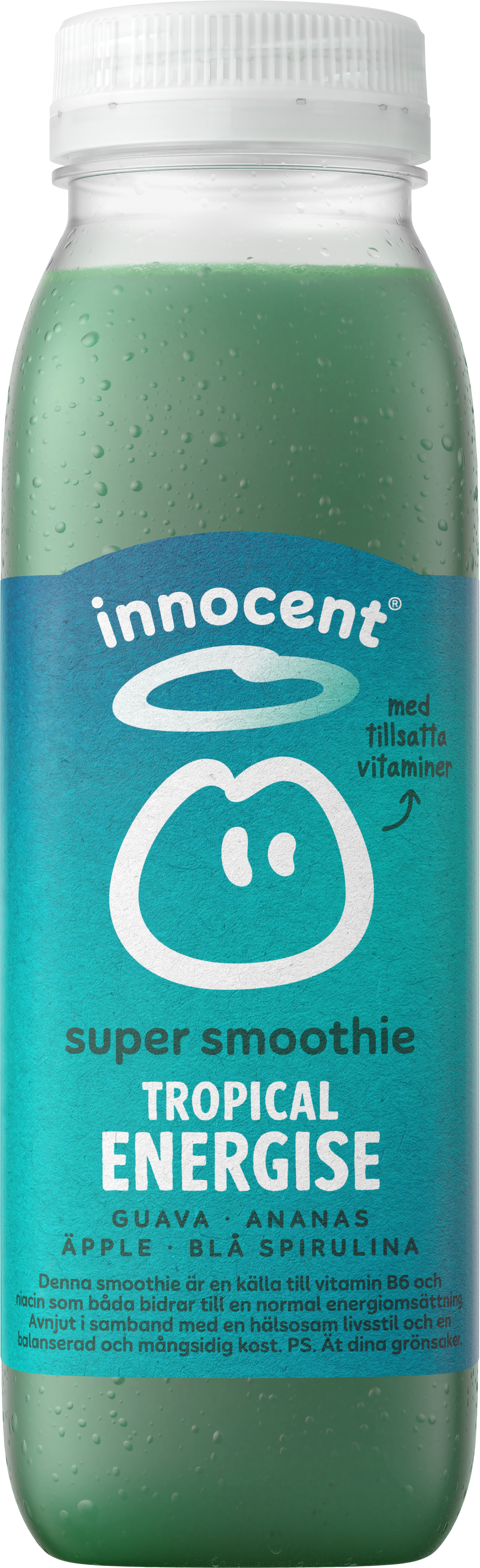 "description": "1 pressað epli (53%), 1/2 maukaður banani, ananassafi (9%), 1/2 maukaður guava ávöxtur (9%), kókosvatn (8%), 1/4 pressuð hvít gulrót, ástríðualdinmauk, spírulínaþykkni (0,8%), súraldinsafi, vítamín (C, B3, B5, B6, fólínsýra og B12).",