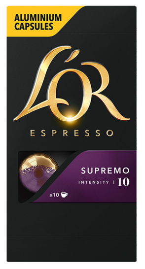 "description": "L'OR Espresso Supremo er með styrk 10 og unnið úr 100% Arabicabaunum.",