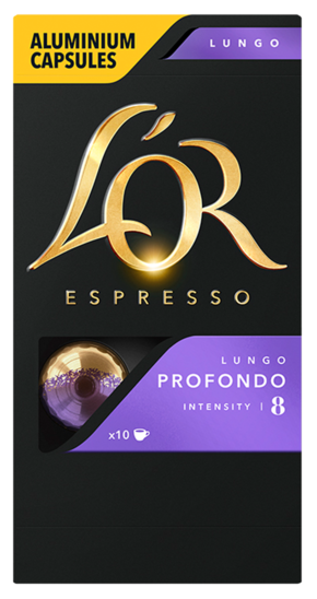 "description": "L'OR Espresso Lungo Profondo er með styrk 8 og unnið úr 100% Arabicabaunum.",