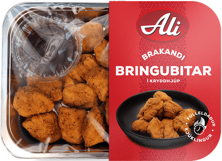 "description": "Kjúklingabringa (84%) Vatn, salt, hveiti, maissterkja, svartur pipar hvítur pipar, paprika, engifer, hvítlauksduft, glúkósasíróp, sýrustillir (E500),bindiefni (E450) rotvarnarefni (E262), þráavarnarefni (E320), bragðefni, krydd, repjuolía, / BBQ sósa Háfrúktósa kornsíróp, eimað edik, tómatmauk, umbreytt maissterkja, salt, ananasþykkni, reykbragðefni SF-005, krydd, karmelulitur (E150d), mólassi, rotvarnarefni (E211), hvítlaukur,SINNEPSDUFT, kornsíróp, sykur, tamarind, SOJA, náttúruleg bragðefni, SELLERÍFRÆ. ",