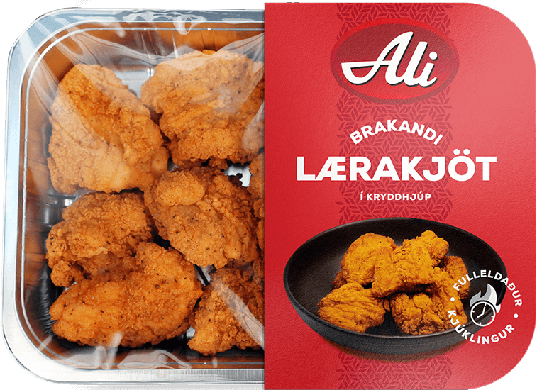 "description": "Innihaldsefni: Kjúklingalærakjöt (76%) Vatn, salt, hveiti, maissterkja, svartur pipar hvítur pipar, paprika, engifer, hvítlauksduft, glúkósasíróp, sýrustillir (E500),bindiefni (E450) rotvarnarefni (E262), þráavarnarefni (E320), bragðefni, krydd, repjuolía",