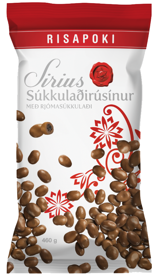 "description": "Rjómasúkkulaði (sykur, kakósmjör, NÝMJÓLKURDUFT, undanrennuduft (MJÓLK), kakómassi, ýruefni (SOJALESITÍN), bourbon vanilla. Kakóþurrefni að lágmarki 33%), rúsínur 29%, jurtaolíur (kókos- repju- og sólblómaolía), húðunarefni (E414), glúkósasíróp, sykur.",