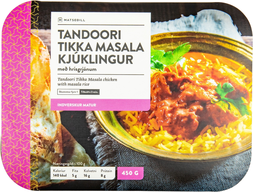 "description": "Sósa 44% (marinering (grísk jógúrt (NÝMJÓLK sýrð með jógúrtgerlum og síuð), Tandoori masala krydd (salt, karrí (turmerik, kóríander, fenugreek, dillfræ, negull, chili) broddkúmen, laukur, hvítlaukur, kórínader, bragðefni (maltódextrín, repjuolía), cayenne pipar, svartur pipar, engifer, kanill, kekkjavarnarefni (E551), litarefnisþykkni úr papriku, negull, sykur, sítrónusýra), laukur, vatn, tómatpúrra, jógúrt (NÝMJÓLK sýrð með jógúrtgerlum og síuð), jurtarjómi (SÚRMJÓLK, grænmetisolía, RJÓMI 6%, grænmetisolía (pálma), SÚRMJÓLKURDUFT, ýruefni (E472b, E475, E471, E433), bindiefni (E407, E410), salt, náttúruleg bragðefni (MJÓLK), litarefni (E160(a)), engiferþykkni, hvítlauksþykkni, sítrónusafi, broddkúmen, rautt chili, salt, garam masala, fennel greek fræ, turmerik), hrísgrjónablanda 29% (vatn, Basamati hrísgrjón 37%, repjuolía, broddkúmen, kanill, kardimommur, negull, salt, turmerik), kjúklingakjöt 27%.",