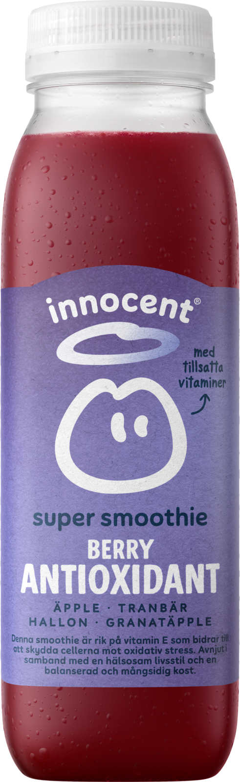 "description": "Pressað epli (45%), mulin pera, klípa af pressuðum rauðrófum, skvetta af kreistu granatepli (6,4%), mulin hindber (4,6%), mulin sólber, mulin trönuber (1,5%), mulin hörfræ (0,35%), baobab ávöxtur, vítamín (B1, B2, B3, B6, C og E).",