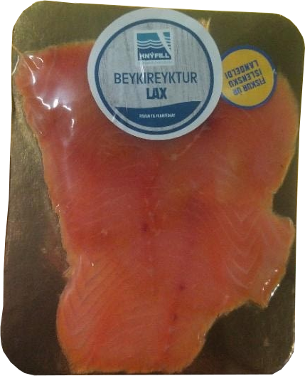 "name": "Hnýfill beykireyktur lax í sneiðum",