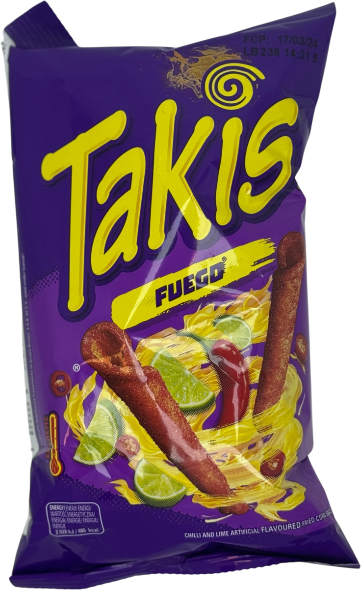 "descriptionDetail": "Seasoned Chilli and Lime Flavour Corn Snack. Face the Intensity, Extreme the New Takis Fuego! Intense flavour, rolled into an awesome snack!",