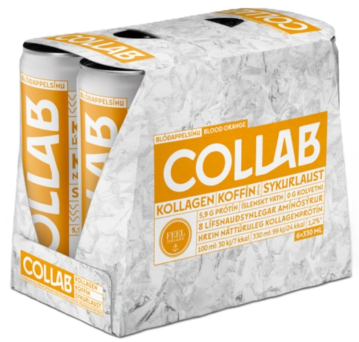 "descriptionDetail": "COLLAB er frískandi drykkur með ríkulegu magni af virkum efnum án allra kolvetna og sykurs. Hver dós inniheldur 105mg koffín og 6 mismunandi B-vítamín auk 5.9g af kollageni, eins umtalaðasta fæðubótarefni okkar tíma. Kollagenið í COLLAB inniheldur 18 mismunandi amínósýrur og kemur frá FEEL Iceland.",
