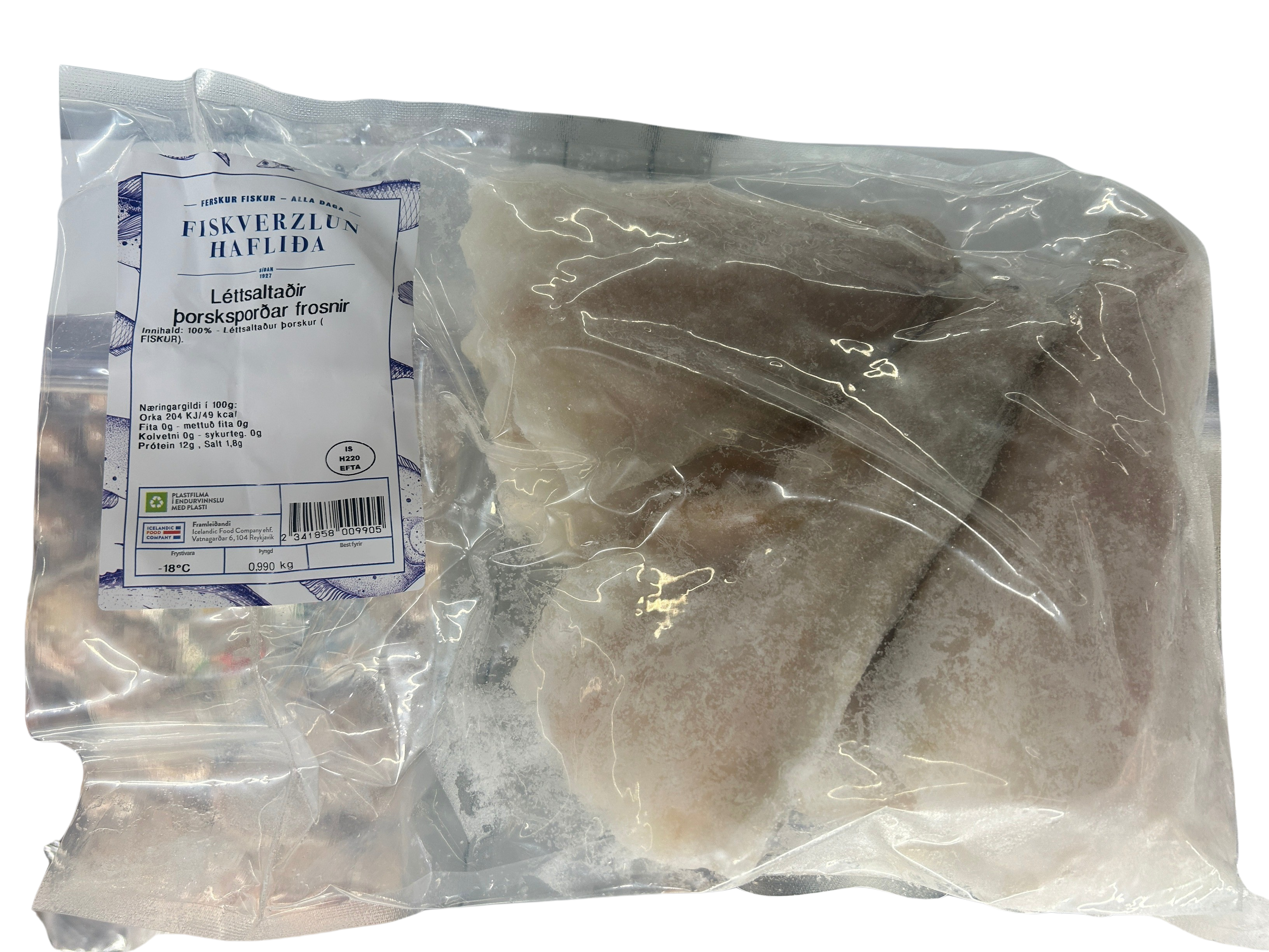 "description": "100% - Léttsaltaðir þorsksporðar (FISKUR).",