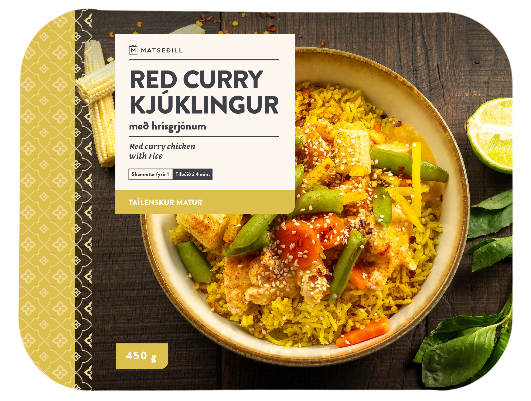 "description": "40% - Hrísgrjón, 20% - kjúklingabringur ((98%), vatn, kókos, salt, glúkósasíróp,\nnáttúruleg bragðefni, chilli, sítrónugras, hvítlaukur, engifer, skalottlaukur, rækjur\n(KRABBADÝR), lime, kúmenduft, bindiefni (E450), sýrustillar (E331, E500)),\ngrænmetisblanda (maískorn, gulrætur, sykurbaunir), kókosmjólk (kókosmjólk, vatn,\nbindiefni (E412, E435, E460), rotvarnarefni (E223 inniheldur SÚLFÍT)), repjuolía,\nlaukur, paprika, rautt karrý mauk (rauður chili, sítrónugras, hvítlaukur,\nskalottlaukur, salt, kaffir sítrónulauf, galangal rót, krydd (kóríander, fræ, kúmen)),\nmaíssterkja, engifermauk (engifer, vatn, salt, sólblómaolía, sýrustillir (E330),\nbindiefni (E412, E415), rotvarnarefni (E202)), broddkúmen, hvítlaukur, salt,\ntúrmerik, lime safi (lime safi úr þykkni, rotvarnarefni (E 224 inniheldur SÚLFÍT),\nfiskisósa (ansjósur (FISKUR), salt, sykur), basilika, kanill, negull, kardimommur.",