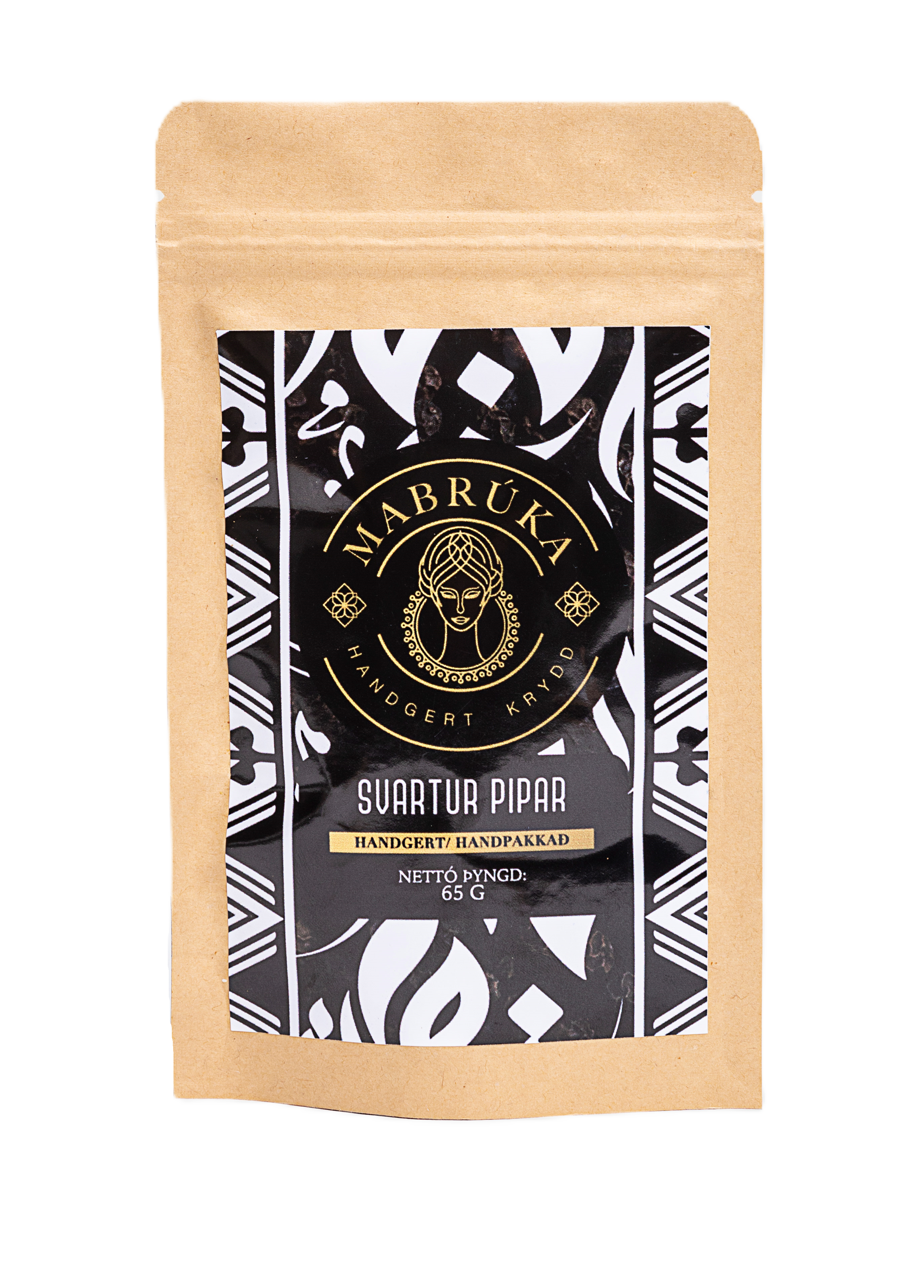 "descriptionDetail": "Fersk svört piparkorn\n\nMabrúka býr til handgert og sólþurrkað krydd frá grunni eins og í gamla daga. Kryddið okkar er búið til með móðurást í Túnis en það passar fullkomlega fyrir íslenskan mat! \n\nSvarti piparinn okkar er sérstaklega ferskur. Mamma velur hann sjálf til þess að passa upp á gæðin. Allt ferlið er gert í höndunum þar til við pökkum piparnum.\n\nSkoðið https://mabruka.is/recipes/ eða Instagram okkar fyrir skemmtilegar uppskriftir.",