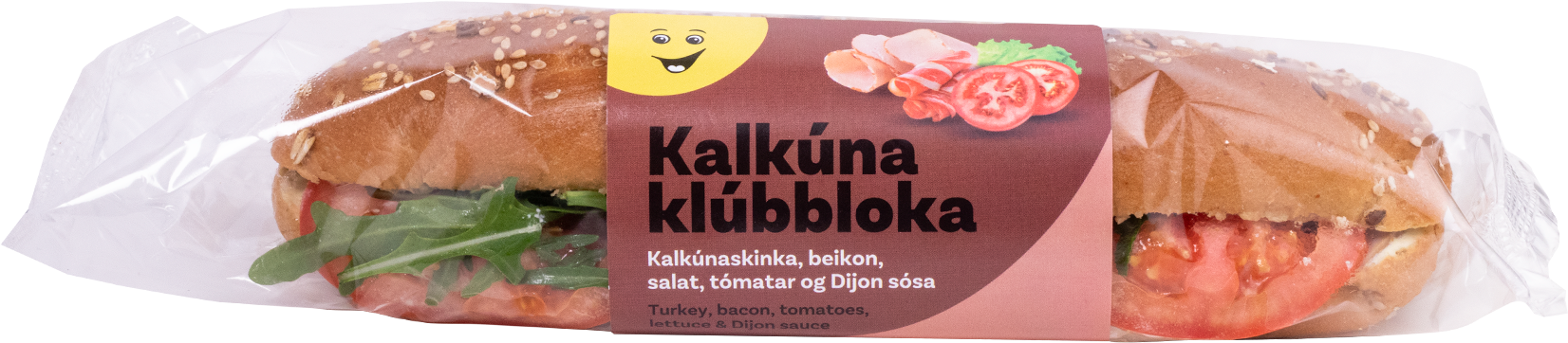 "description": "Brauð 55% (HVEITI, vatn, kornblanda (SESAMFRÆ, HVEITIFLÖGUR, HAFRAMJÖL, hörfræ, salt, sólkjarnafræ), sykur, smjörlíki (jurtaolíur (pálma, repju), vatn, salt, bragðefni), ger, maltextrakt (BYGG, vatn), salt, þrúgusykur, ýruefni (E472e, E481), repjuolía, mjölmeðhöndlunarefni (E300)), tómatar, samlokusósa (majones (repjuolía, EGGJARAUÐUR, sýrustillir (E260, E296), sykur, salt, sterkja, bindiefni (E410, E212, E401), rotvarnarefni (E202)), dijon SINNEP (vatn, SINNEPSFRÆ, edik, salt, rotvarnarefni (E224, inniheldur SULFÍT), sýrustillir (E330)), gúrkusalat (gúrka, vatn, sykur, edik, salt, hvítur pipar), súrar gúrkur (gúrka, sykur, edik, salt, bindiefni (E415, E433), rotvarnarefni (E211), rauð paprika, krydd, litarefni (E102)), sætt SINNEP (vatn, edik, sykur, SINNEPSFRÆ, salt, krydd), límónusafi (límónur, þráavarnarefni (E224), inniheldur SULFÍT), salt, hvítur pipar), kalkúnaálegg 16% (Kalkúnabringur, alifuglakjöt, vatn, salt, þrúgusykur, bindiefni (E451, E407, E410), gerextrakt, þráavarnarefni (E301, E330), bragðefni, sykur, pipar, rotvarnarefni (E270)), beikon 5% (íslenskt grísakjöt, vatn, salt, bindiefni (E451, E450), rotvarnarefni (E250), þráavarnarefni (E316), maltódextrín), salat. Gæti innihaldið snefil af hnetum. Ofnæmisvaldar eru í HÁSTÖFUM.\n",