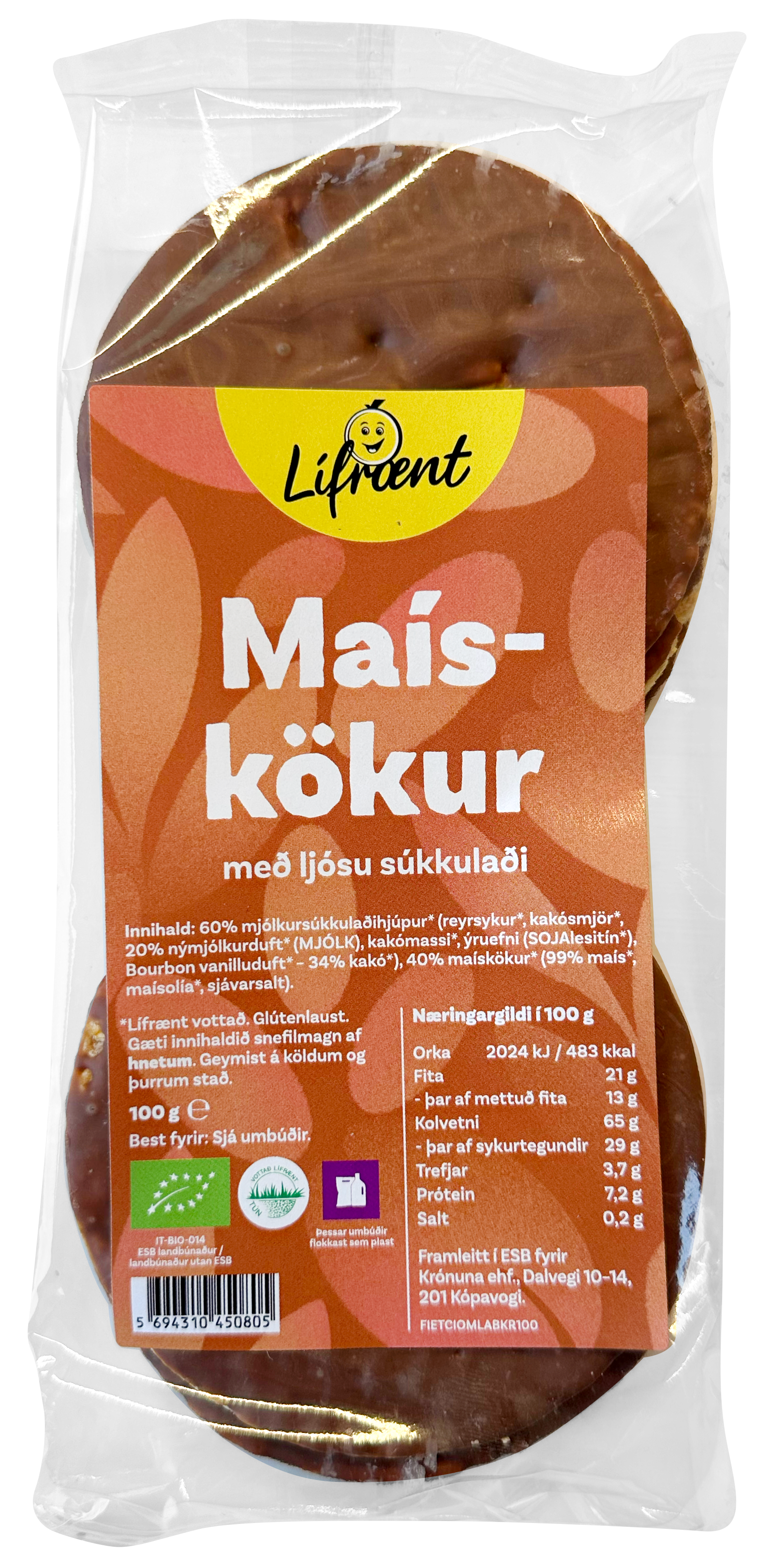"description": "60% mjólkursúkkulaðihjúpur* (reyrsykur*, kakósmjör*, 20% nýmjólkurduft* (MJÓLK), kakómassi*, ýruefni (SOJAlesitín*), Bourbon vanilluduft* - 34% kakó*), 40% maískökur* (99% maís*, maísolía*, sjávarsalt). *Lífrænt vottað",