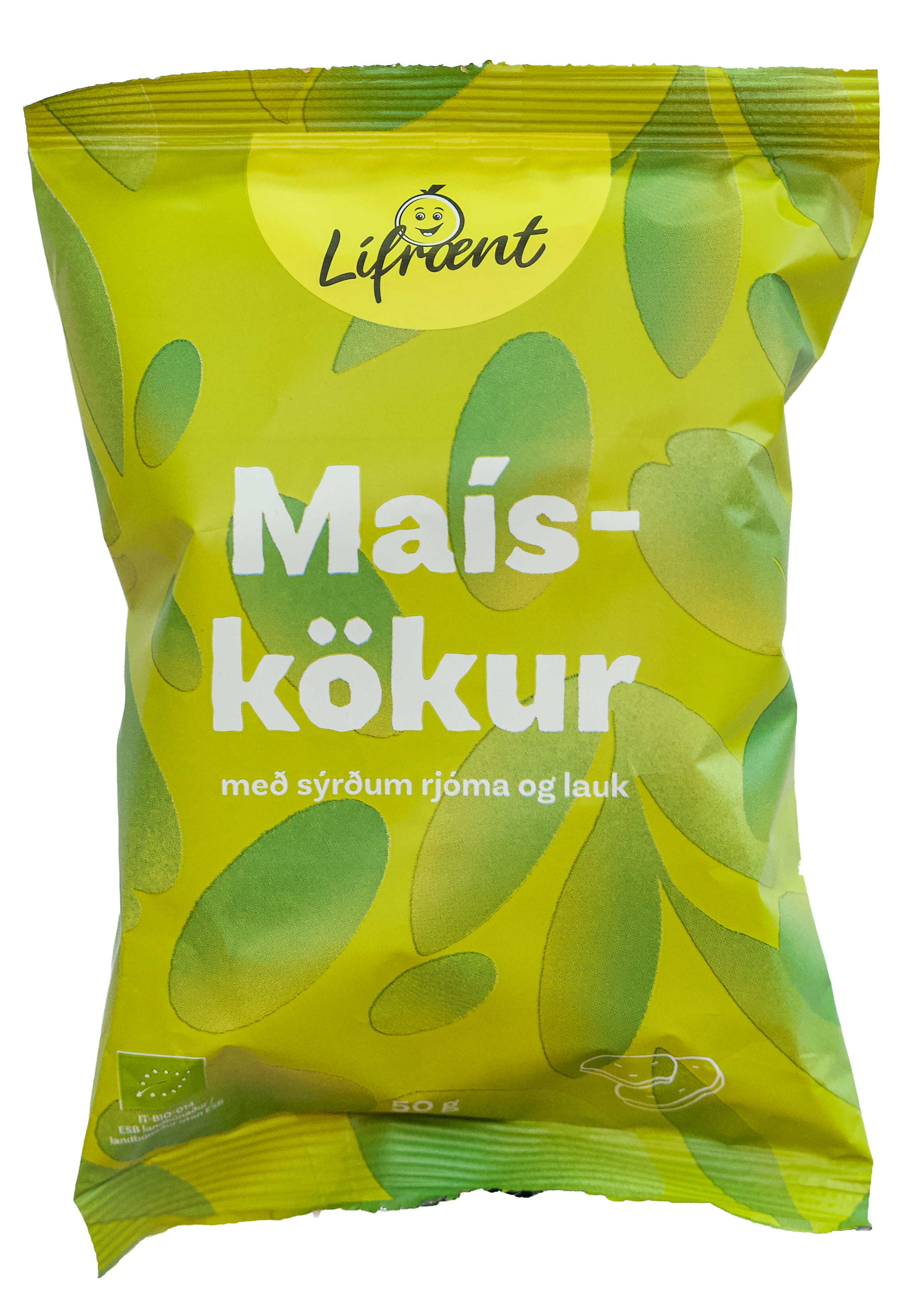"description": "71% maís*, jurtaolíur* (sólblómaolía* og maísolía*), mjólkurduft* (MJÓLK), maíssterkja*, sjávarsalt, sykur*, 0,7% laukduft*, gerþykkni*, graslaukur*, sýrustillir (mjólkursýra), 0,2% rjómakraftur* (MJÓLK). *Lífrænt vottað.",