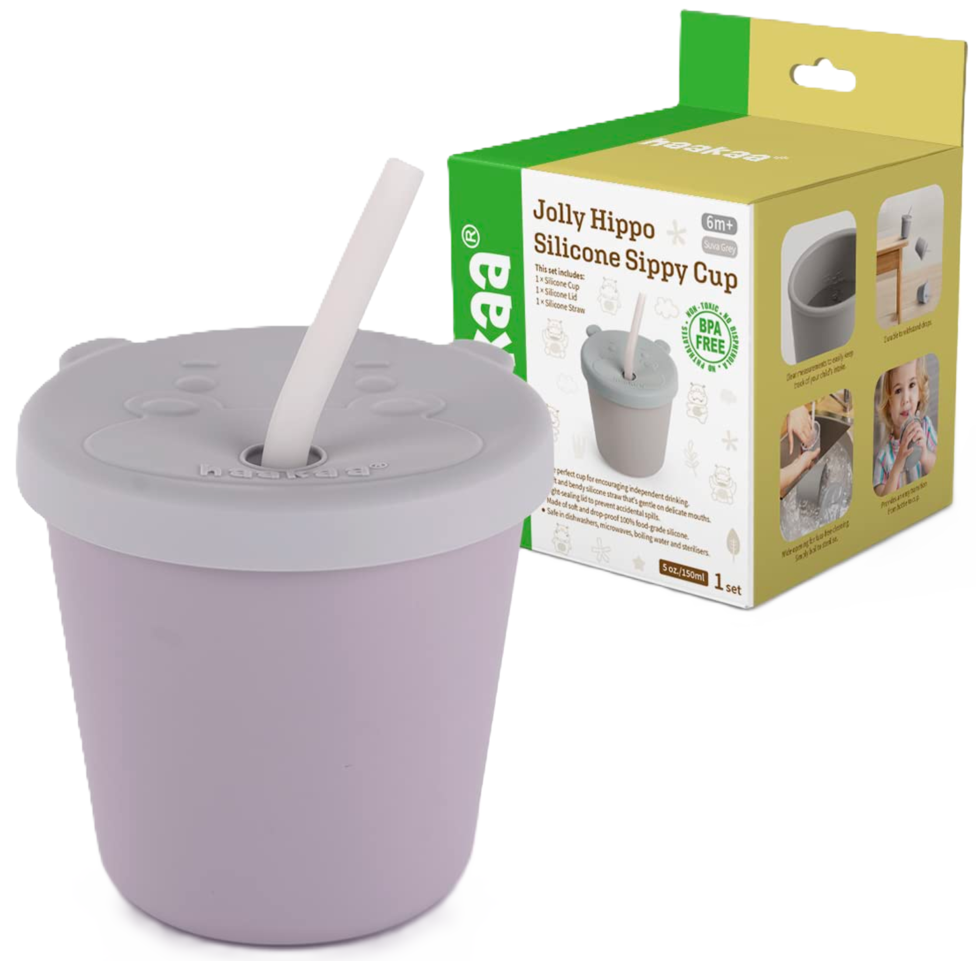 "descriptionDetail": "Mjúkt glas með röri. Kemur í tveimur litum. Allir hlutar úr mjúku sílíkoni.\n\nJolly Hippo glasið er létt og með mjúku sílikon röri sem hentar vel fyrir litla góma. Fullkomið fyrir fyrstu sopana. Þétt lok heldur ryki og óhreinindum frá. Þegar barnið er tilbúið má nota glasið opið. Frábært heima og á ferðinni!\n\n- Mjúkt og öruggt sílikon\n- Þéttlokandi lok og mjúkt rör\n- Létt og brotnar ekki – passar í litlar hendur\n- Má fara í uppþvottavél og sjóðandi vatn\n- Hentar frá 6 mánaða aldri – rúmar 150 ml",