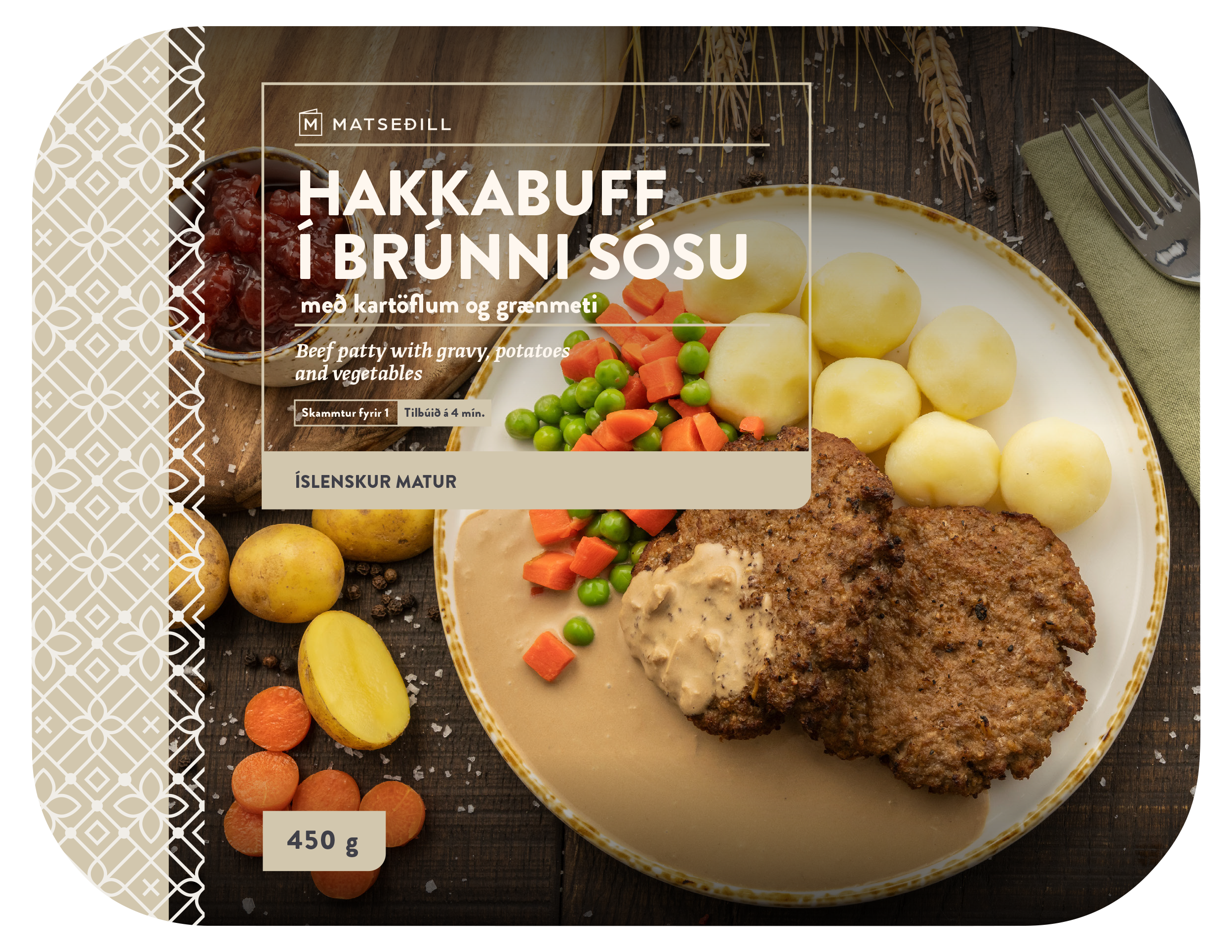 "description": "32% - Hakkabuff (svínkjöt 60%, nautakjöt 33%, hveitibrauðsmolar (hveitimjö\n(HVEITI)l, salt, ger), krydd (inniheldur SELLERÍ), umbreytt sterkja, vatnsrofið\njurtaprótein, sykur, sólblómaolía, gulrót, nátturuleg bragðefni, vatn, repjuolía,\nbindiefni (dífosföt)), 28% - sósa (vatn, jurtarjómi (súrmjólk (MJÓLK), jurtaolía\n(hert pálmaolía), rjómi (MJÓLK), súrmjólkurduft (MJÓLK), ýruefni (E472b,\nE475, E435, E471, E433), bindiefni (E410, E407), salt, náttúruleg bragðefni\n(MJÓLK), litarefni (E160a)), laukur, nautakraftur (joðað salt, krydd (SOJA),\nbragðaukandi efni (E621, E635), laktósi (MJÓLK), maltódextrín,\nnautakjötsþykkni, nauta fita, þráavarnarefni (E320), krydd (SELLERÍ),\nsólblómaolía, repjuolía, bragðefni (SOJA)), sterkja (bindiefni (E1422)), sósulitur\n(litarefni (E150c), vatn, salt), sveppakraftur (vatn, sveppaþykkni, salt, maltódextrín,\ngerþykkni, glúkósasíróp, bragðefni, sólblómaolía), hunang, salt, svartur pipar), 20%\n- kartöflur (kartöflur, vatn, salt), 20% - grænmeti (grænarbaunir, gulrætur).",