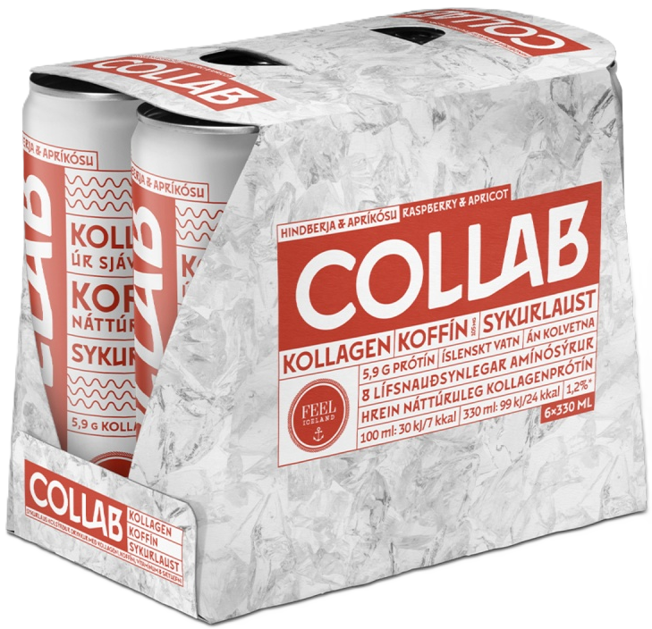 "descriptionDetail": "COLLAB er frískandi drykkur með ríkulegu magni af virkum efnum án allra kolvetna og sykurs. Hver dós inniheldur 105mg koffín og 6 mismunandi B-vítamín auk 5.9g af kollageni, eins umtalaðasta fæðubótarefni okkar tíma. Kollagenið í COLLAB inniheldur 18 mismunandi amínósýrur og kemur frá FEEL Iceland.",