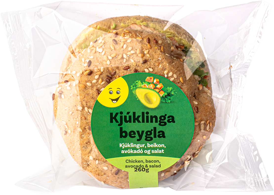 "description": "Beygla 48% (HVEITI, vatn, repjuolía, sykur, HVEITIGLÚTEN, ger, salt, maltað mjöl (HVEITI, BYGG), SOJAMJÖL, ýruefni (E471, SOJALESITÍN), mjölmeðhöndlunarefni (E330)), avókadómauk 23% (avókadó, tómatur, límónusafi (límóna, vatn, sýrustillir (E330), rotvarnarefni (E224), inniheldur SÚLFÍT), kóríander, salt), kjúklingur 17% (kjúklingur, vatn, tapíókasterkja, salt, maltódextrín), beikon 9% (svínakjöt, vatn, salt, bindiefni (E451), rotvarnarefni (E250), þráavarnarefni (E316), maltódextrín), salat.\nOfnæmisvaldar eru í HÁSTÖFUM.\nGetur innihaldið snefilmagn af hnetum.",