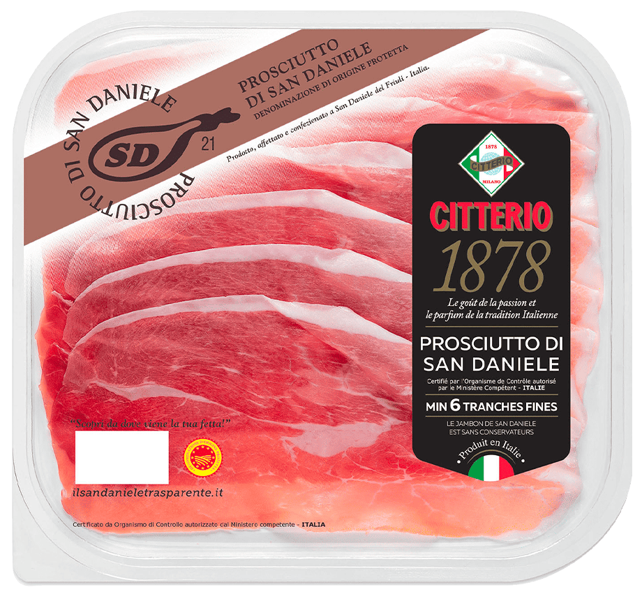 "descriptionDetail": "Prosciutto di San Daniele PDO is a world-famous Italian specialty, produced using only Italian pork legs and sea salt, without preservatives. Citterio's master butchers follow every stage of the salting and curing process for each individual ham at the San Daniele factory. Only after numerous selections does a ham become a Citterio San Daniele Ham, characterised by its unique, sweet and delicate flavour.",