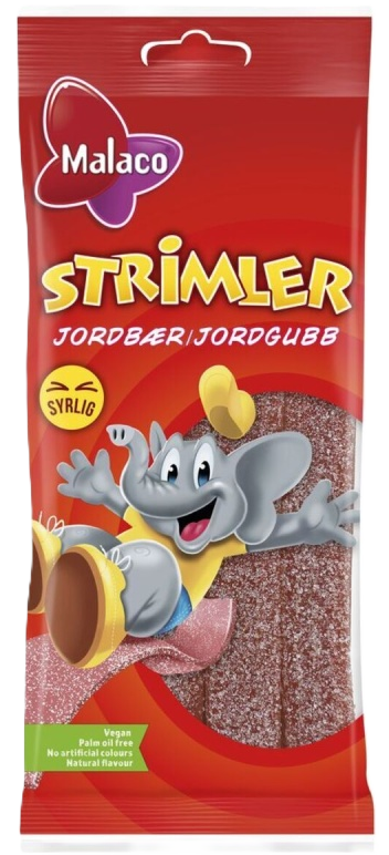 "descriptionDetail": "Malaco Strimler eru nýr, bragðgóður súr kostur. Strimlarnir eru með jarðaberjabragði með súru, sykruðu yfirborði. Vegan, án pálmaolíu, náttúruleg litarefni og bragðefni.",