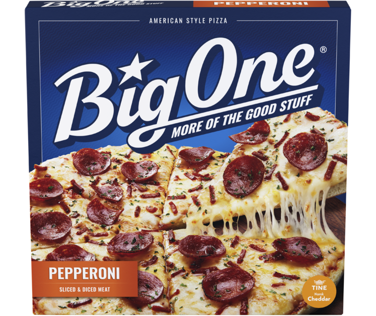 "descriptionDetail": "BigOne Pepperoni er amerísk pizzategund með dásamlega ljúffengu bragði! Hún er toppuð með tveimur tegundum af úrvals pepperóní og ostablöndu úr mozzarella og cheddar. Botninn er pönnubakaður, sem gerir hann þykkan, léttan og stökkan – akkúrat eins og ekta amerísk pizza á að vera!",